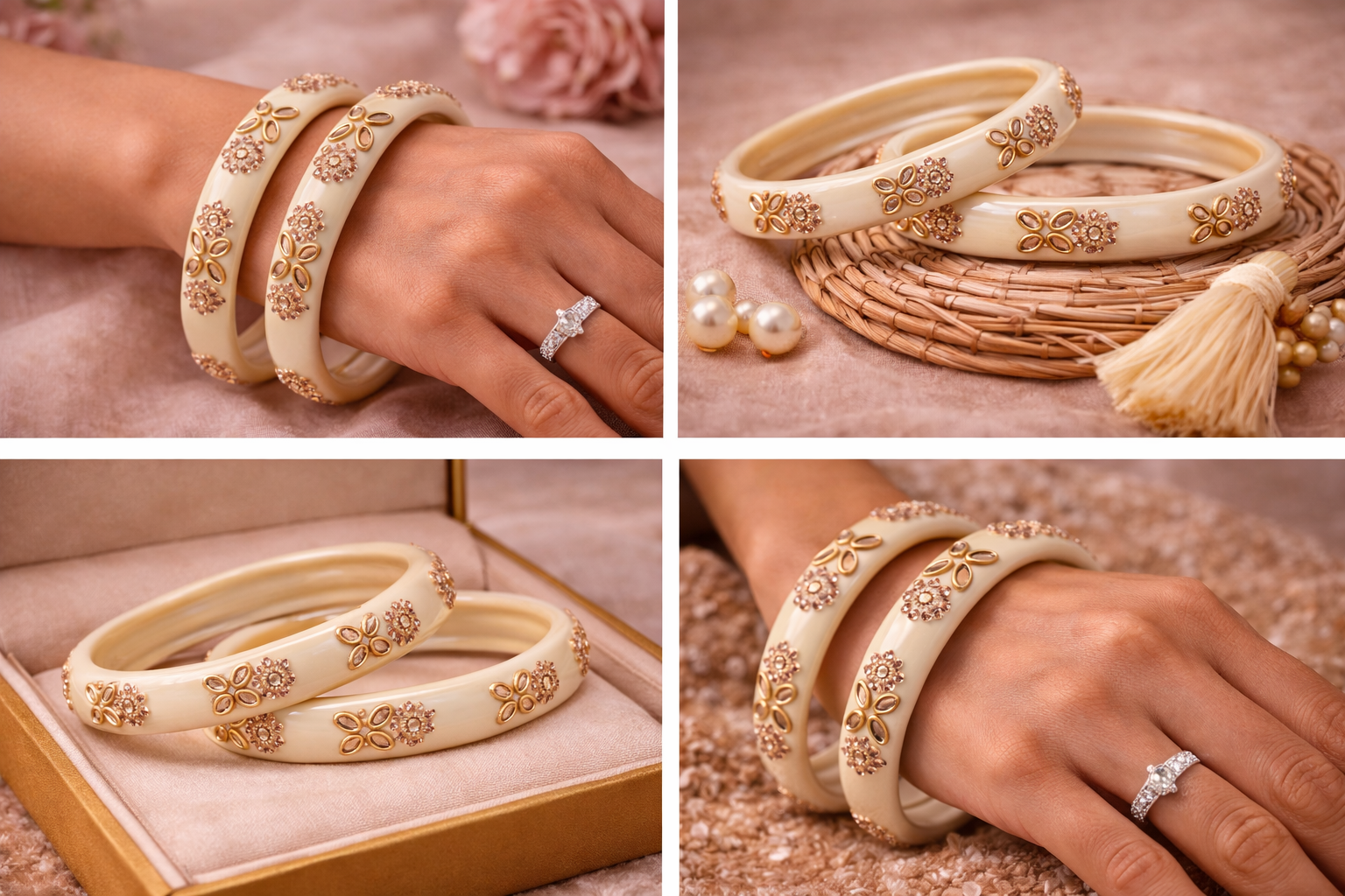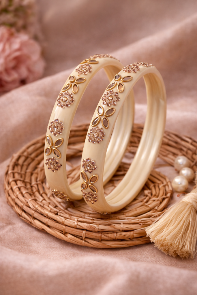 An elegant Cream bangle adorned with intricate kundan-style stone detailing and gold-tone floral accents. Designed to add a rich, festive charm to both traditional and party wear. Perfect as a statement piece or to pair with matching bangles.