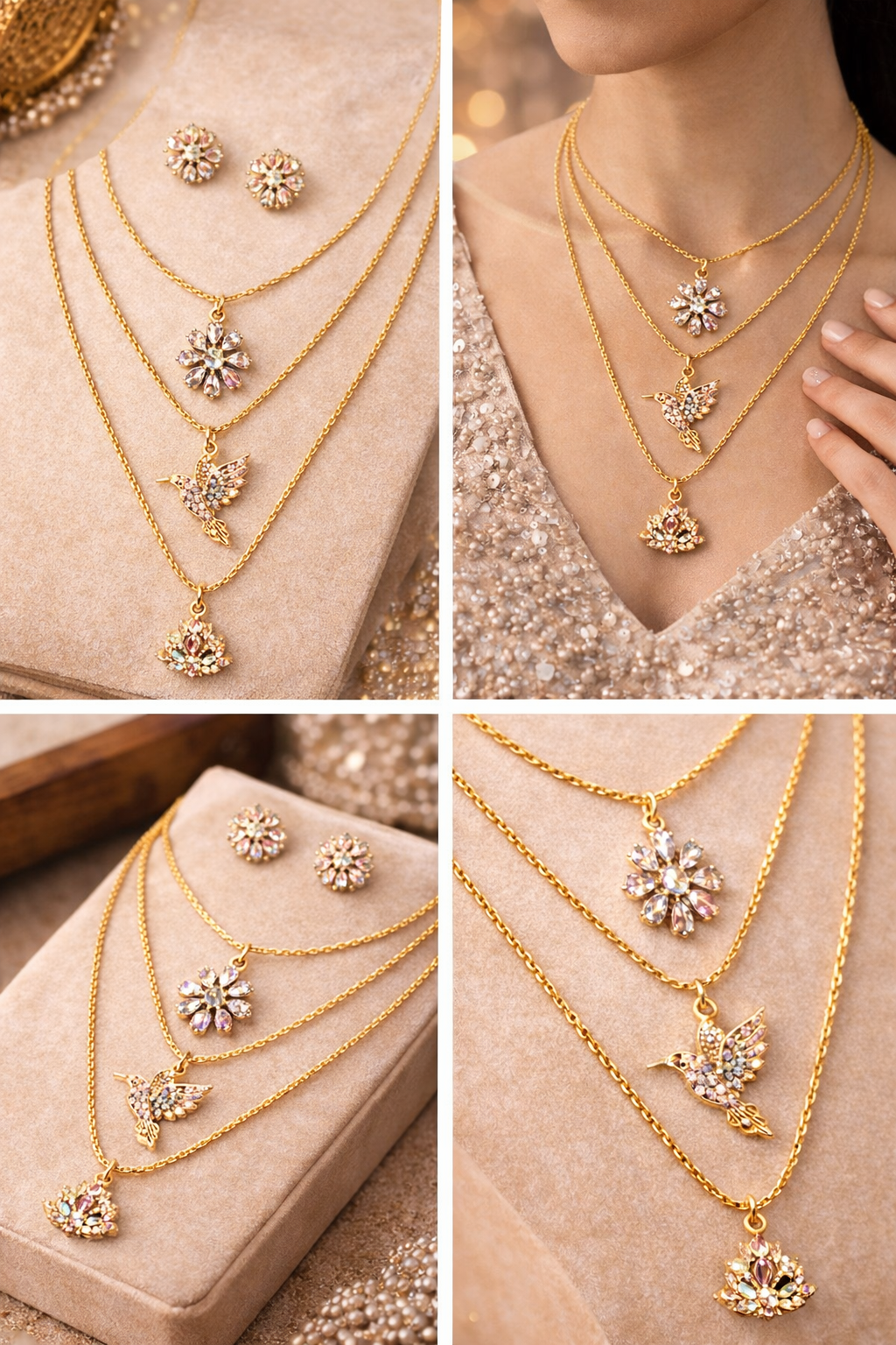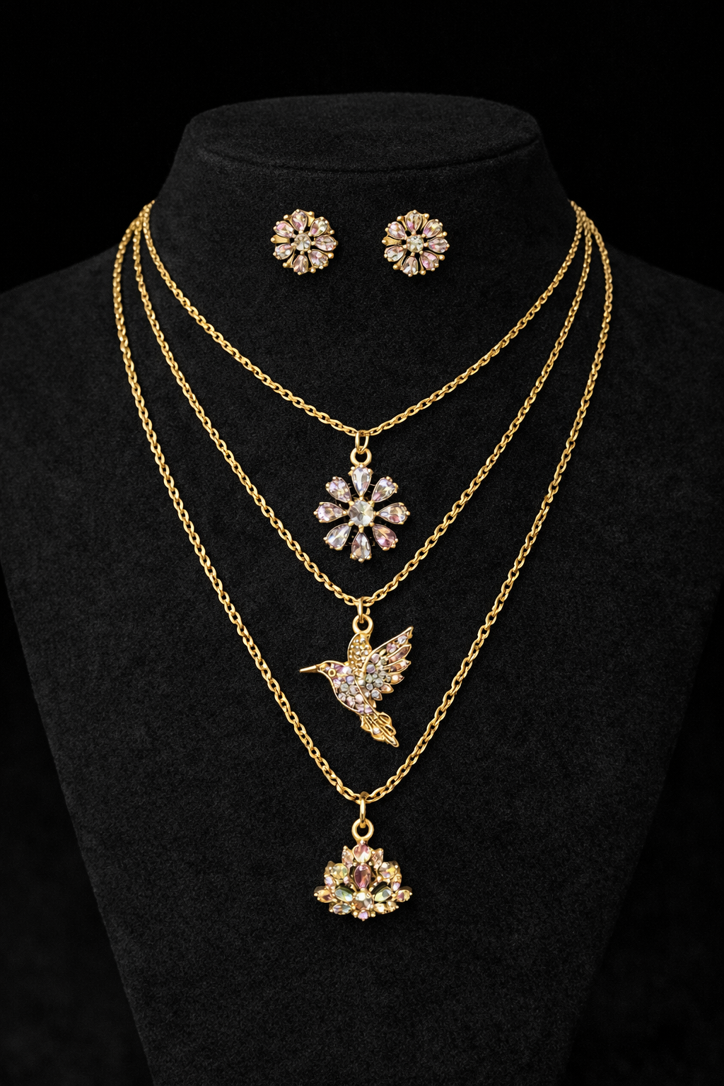 A graceful layered necklace set featuring three delicate gold-toned chains with unique pendants — a floral crystal motif, an elegant bird charm, and a multi-stone drop pendant — paired with matching floral stud earrings. Designed to add effortless elegance to everyday wear and special occasions.