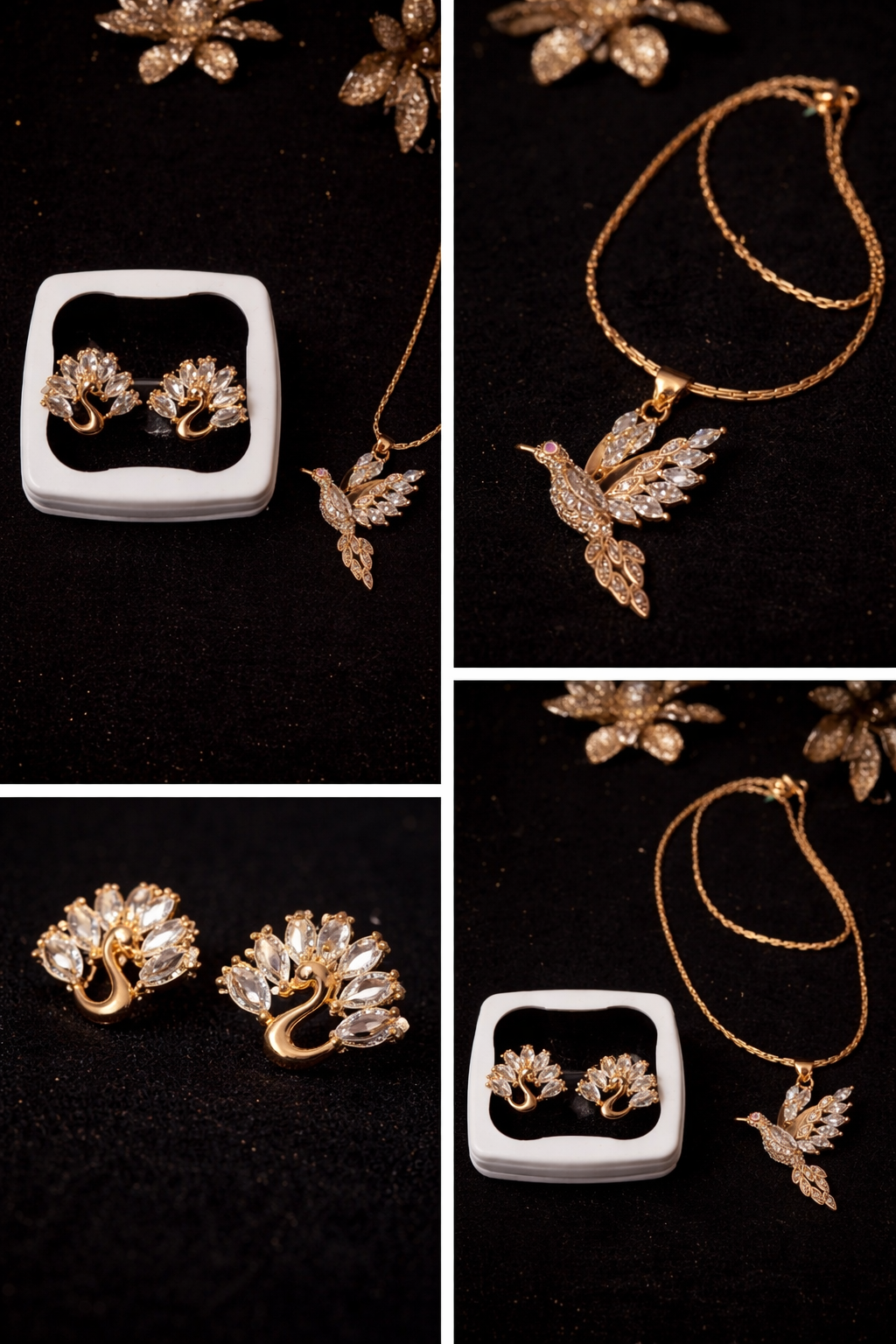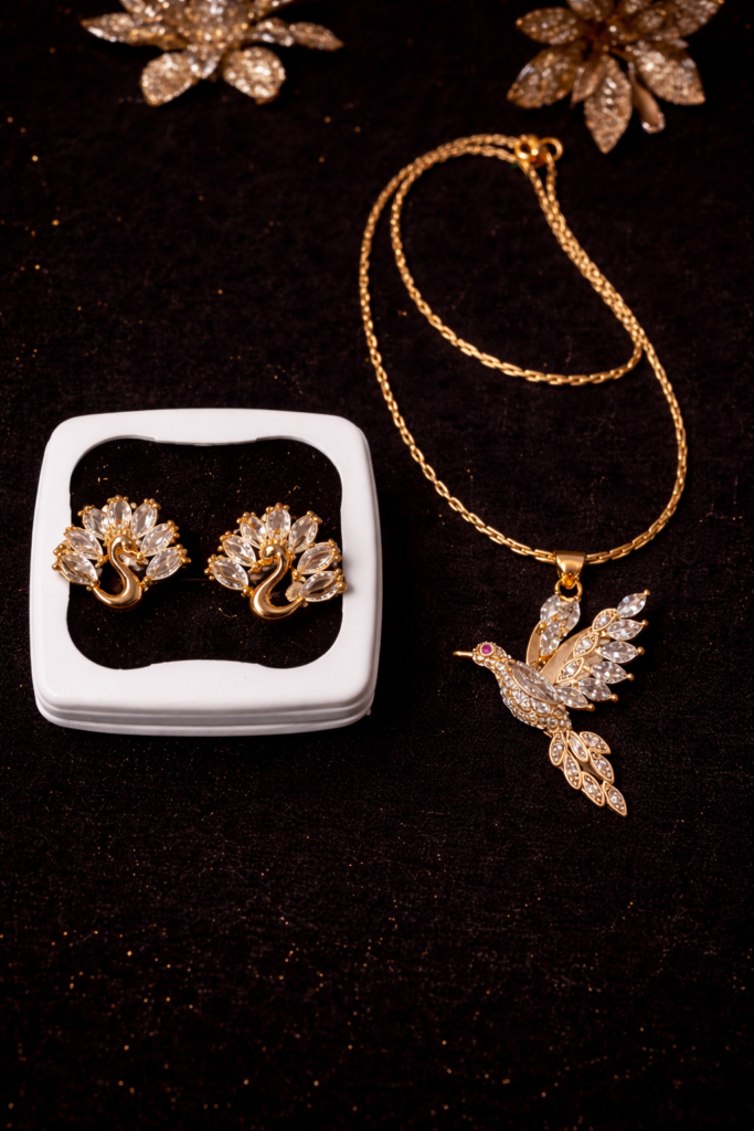 A graceful everyday jewelry set featuring a delicate gold-tone chain with a sparkling bird pendant and matching crystal-studded stud earrings. Designed for effortless office wear and subtle elegance, each piece can be styled together or worn individually to add a refined charm to your daily look.