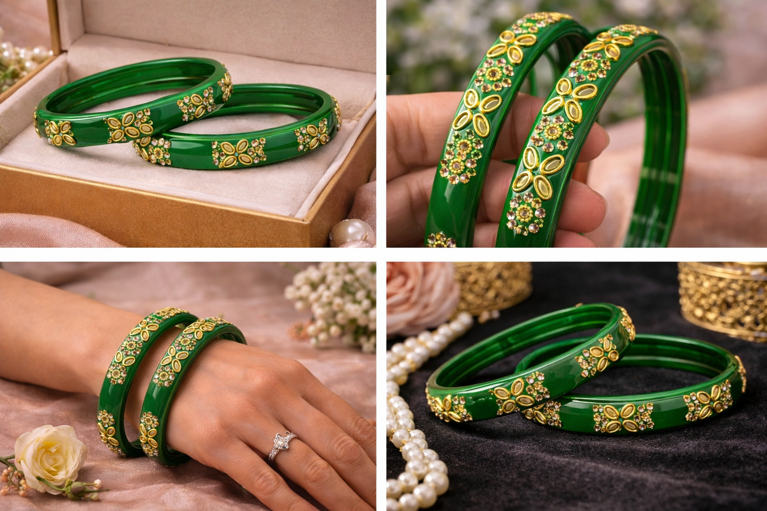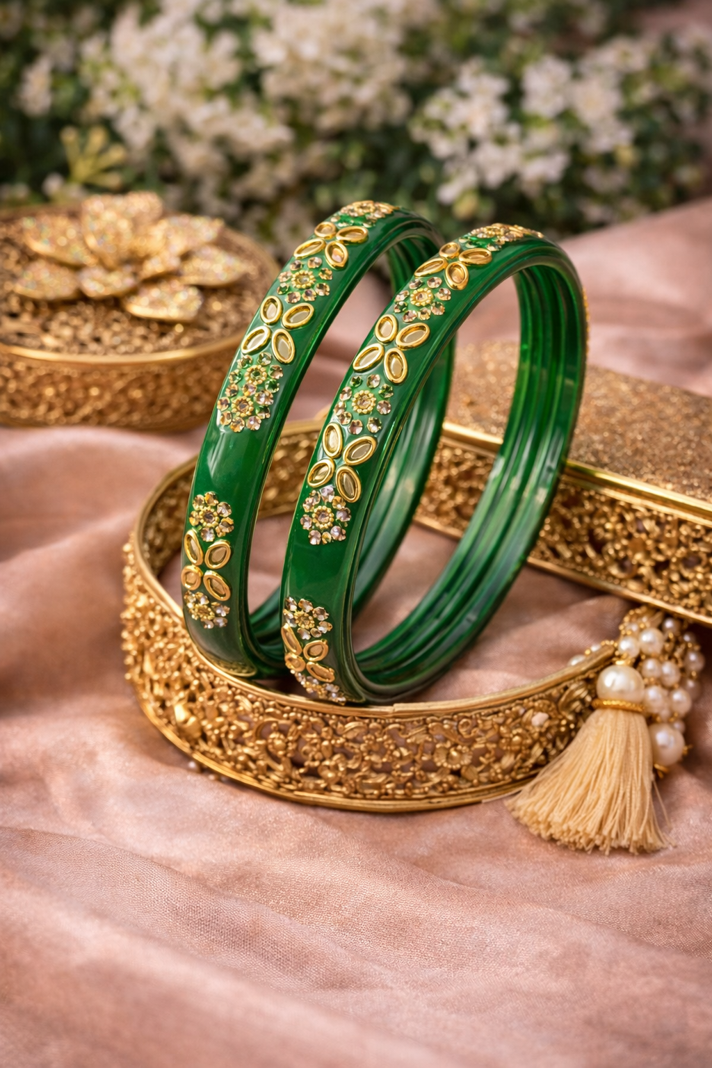 An elegant Gowri-green bangle adorned with intricate kundan-style stone detailing and gold-tone floral accents. Designed to add a rich, festive charm to both traditional and party wear. Perfect as a statement piece or to pair with matching bangles.