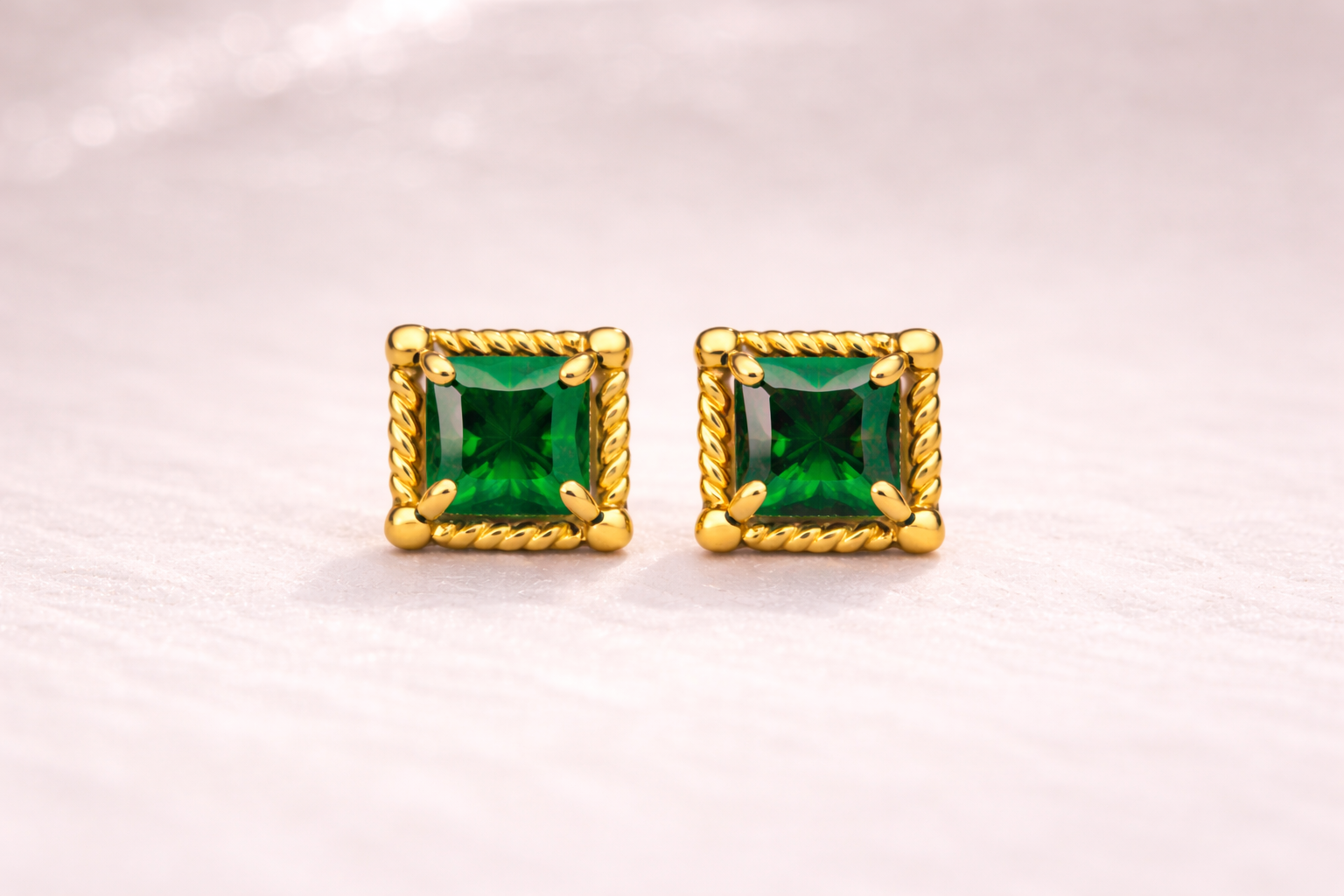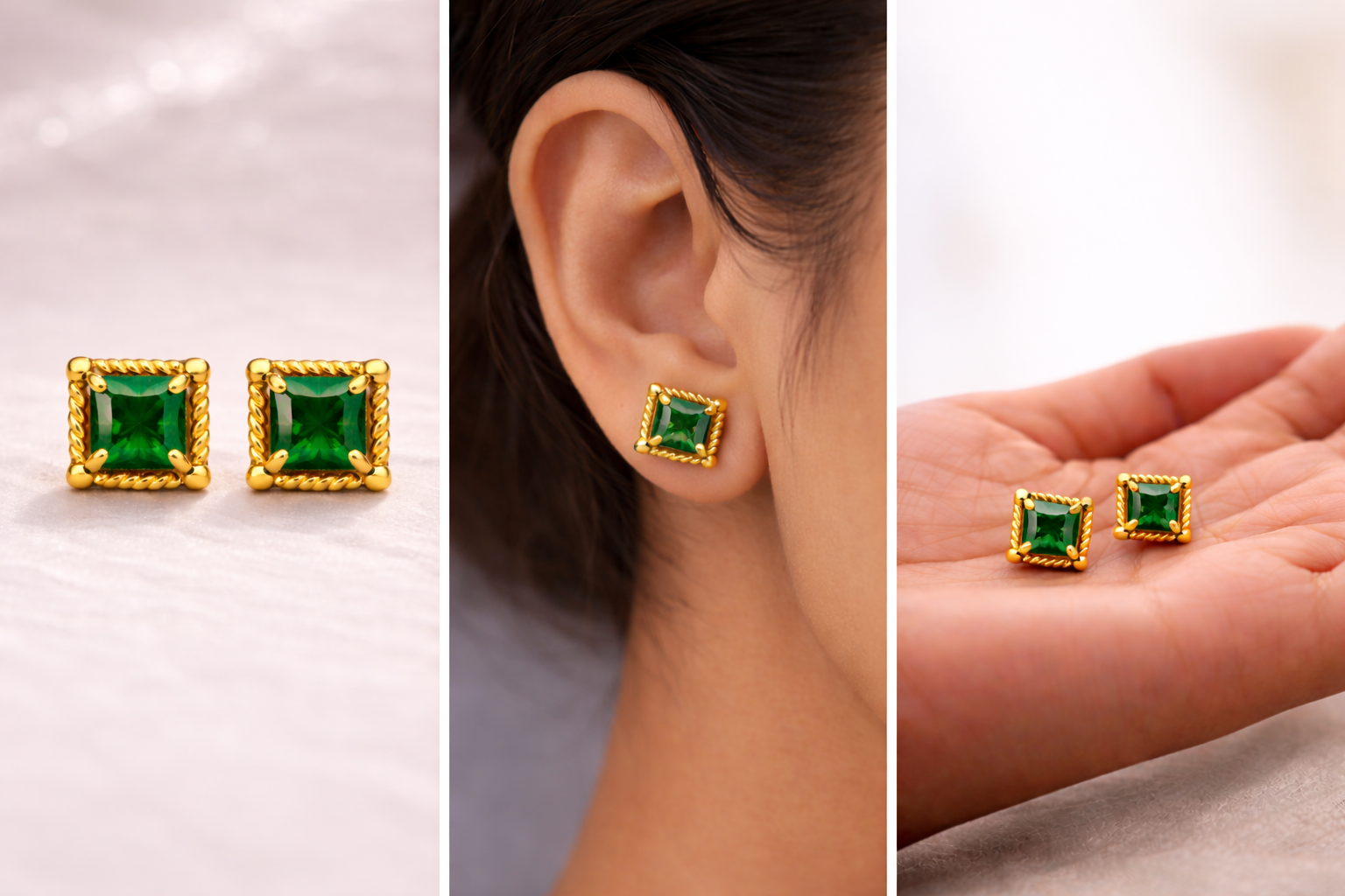 These square green stone studs bring that feeling into your everyday style. The deep green stone sits neatly inside a fine gold-edged square frame, creating a look that feels clean, grounded, and easy to wear. They don’t try too hard, yet they’re impossible to miss.