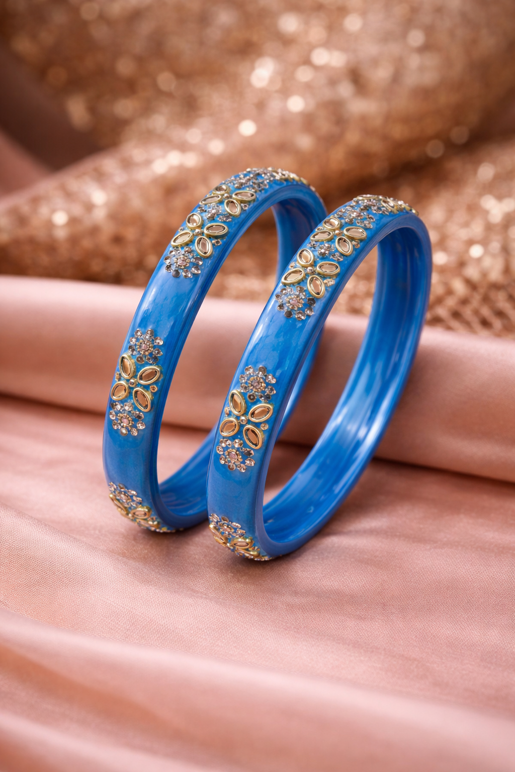 An elegant Ocean-blue bangle adorned with intricate kundan-style stone detailing and gold-tone floral accents. Designed to add a rich, festive charm to both traditional and party wear. Perfect as a statement piece or to pair with matching bangles.