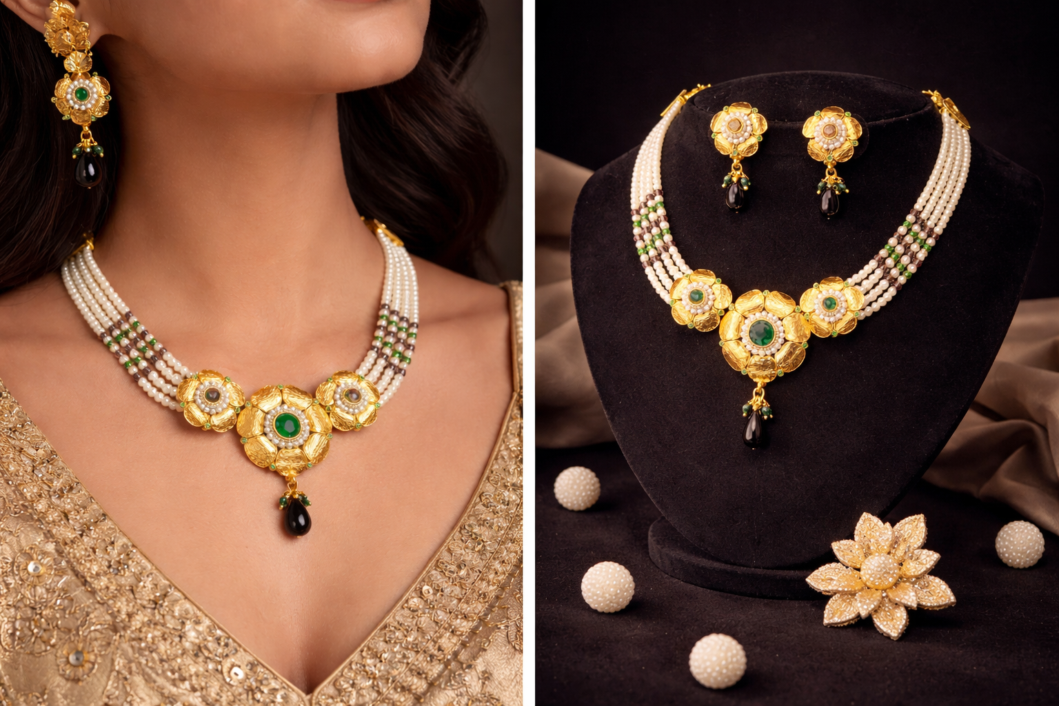 This elegant pearl choker set features a timeless design crafted to highlight traditional beauty with a refined finish. The necklace is adorned with multi-strand pearls and a floral gold centerpiece, enhanced with subtle gemstone detailing for a rich, classic look.
