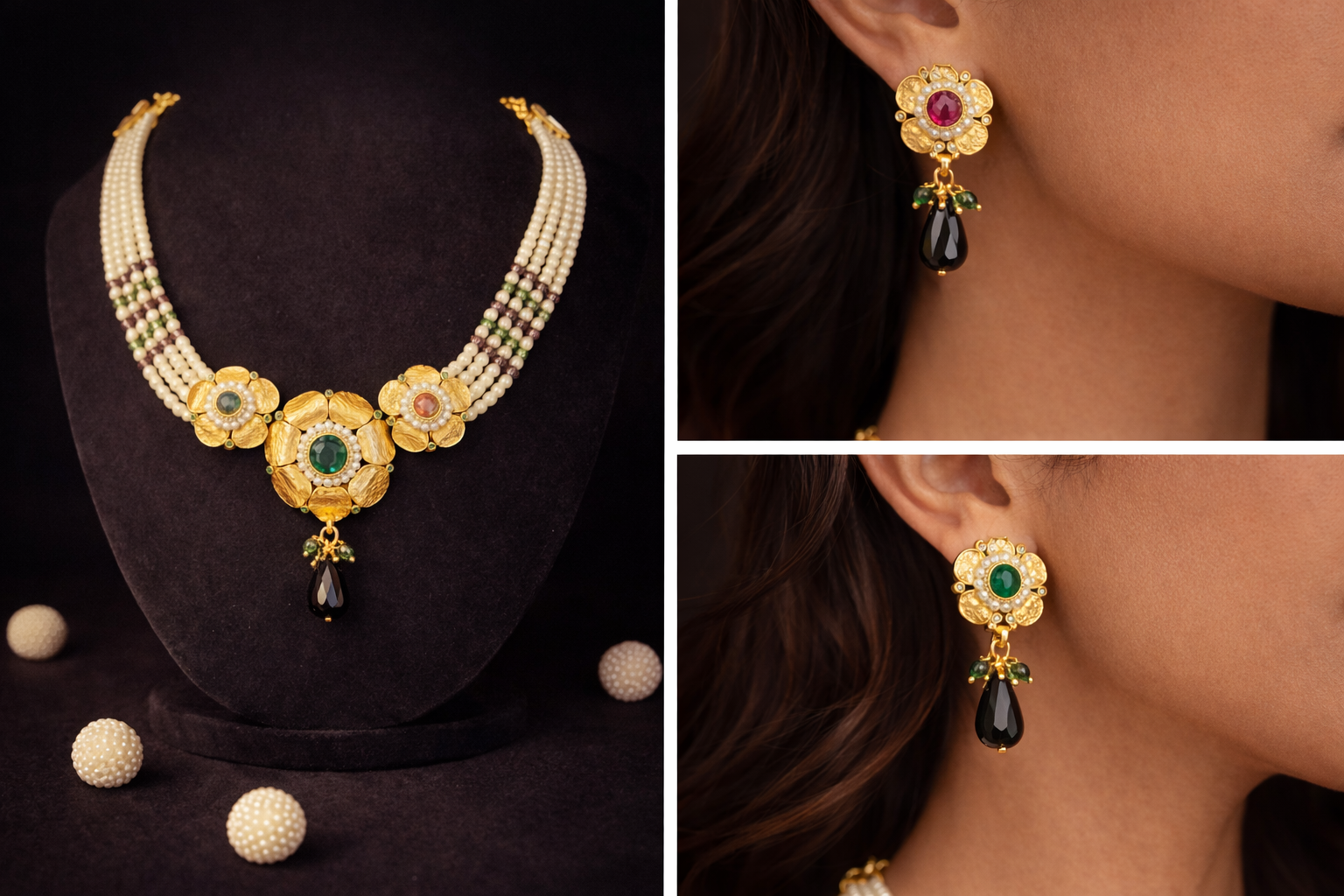 The set comes complete with matching earrings, designed in harmony with the choker, making it a perfect choice for weddings, festive occasions, and traditional celebrations. The combination of pearls and gold accents offers a graceful balance of heritage and sophistication.