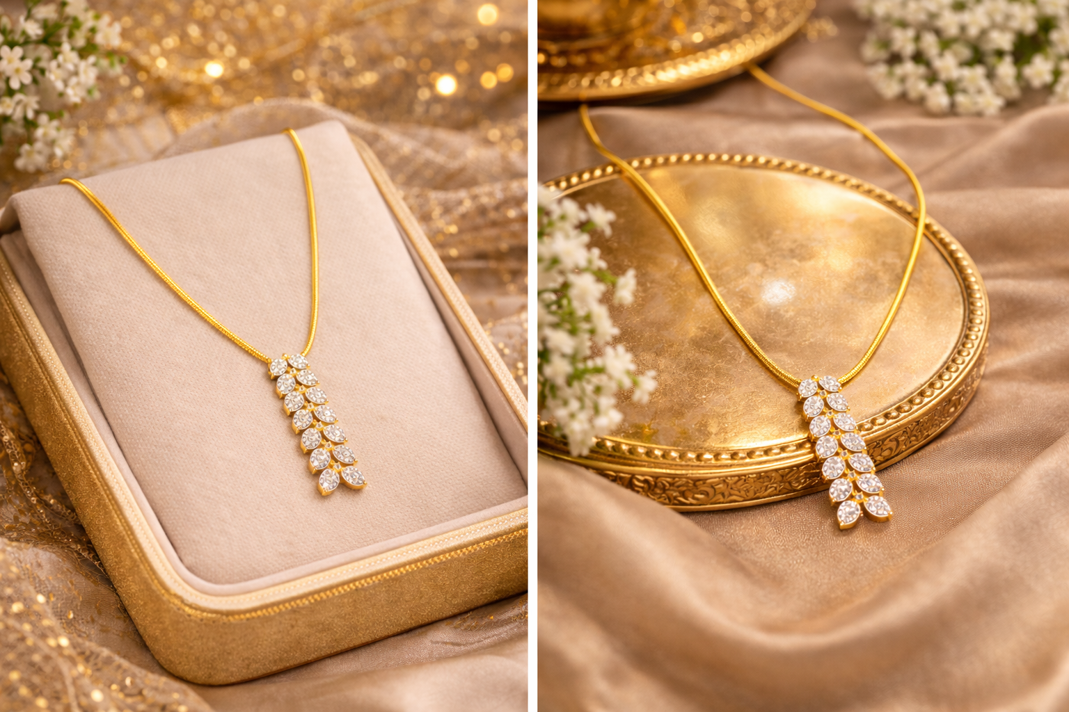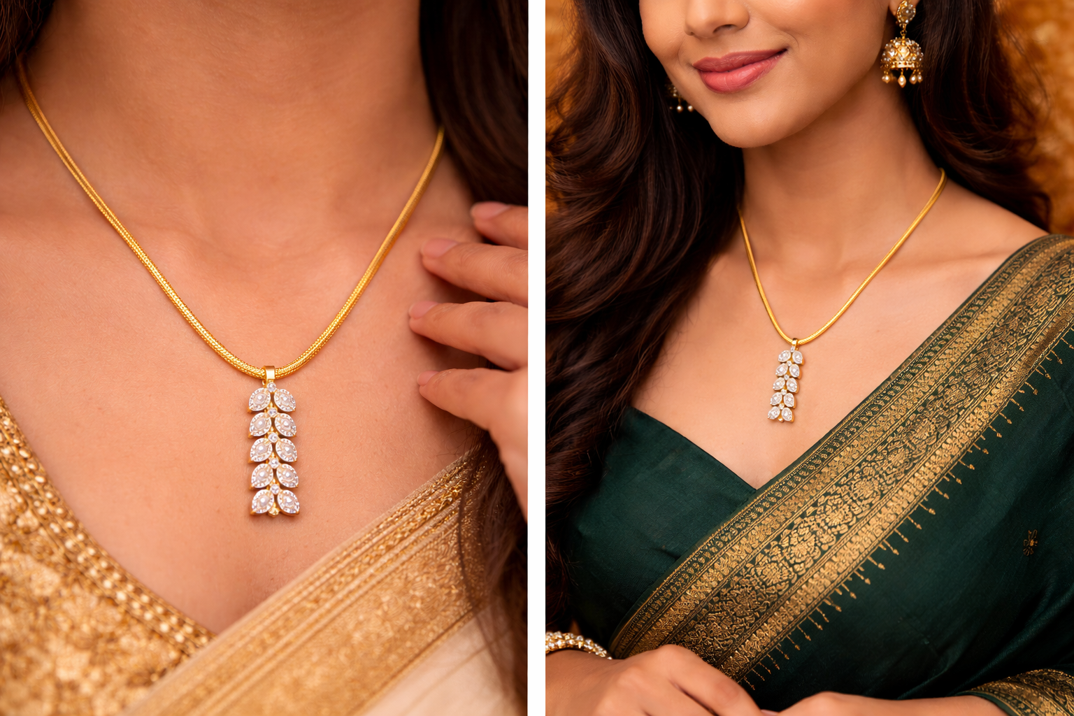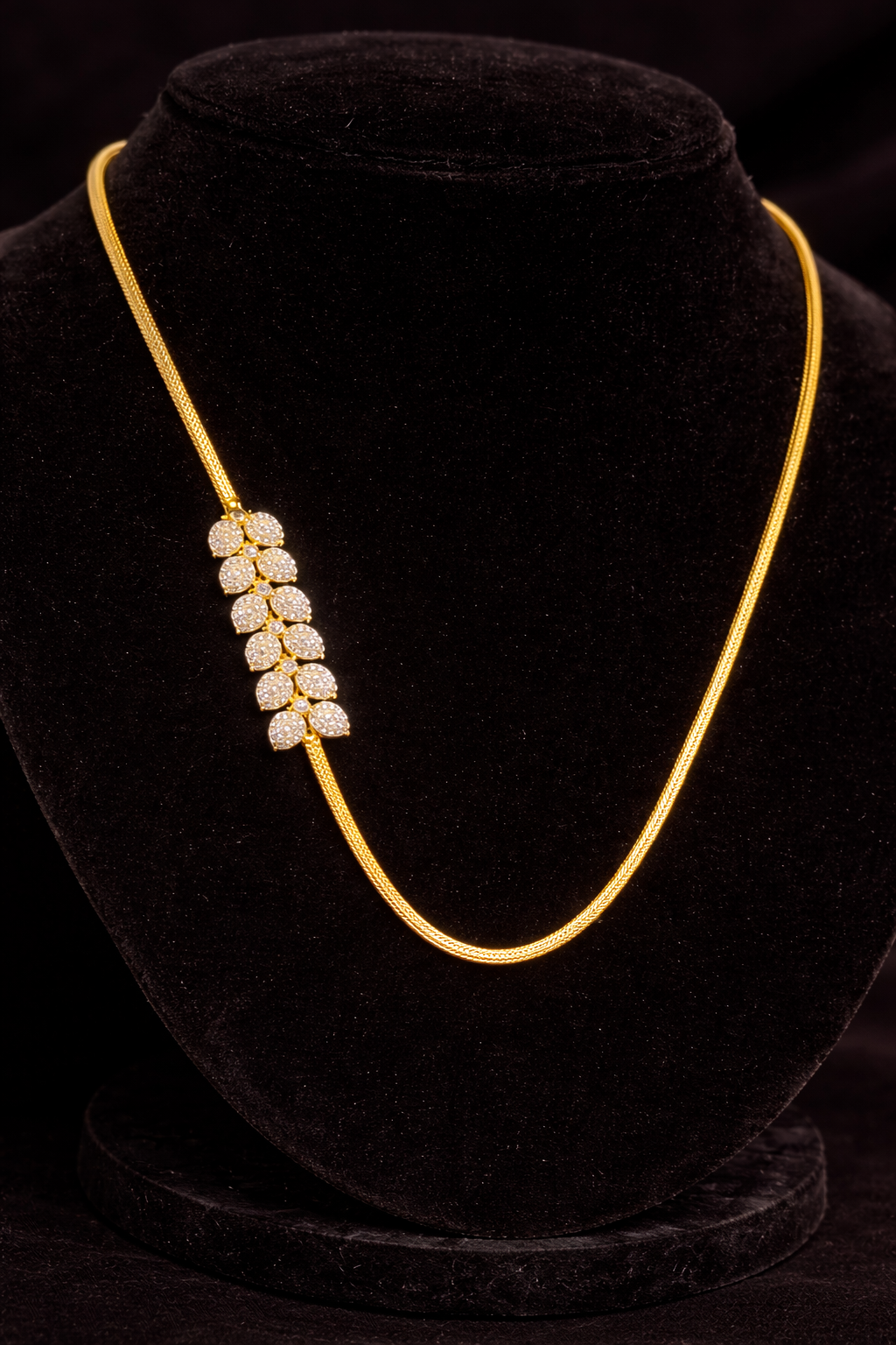 An elegant white stone mangalsutra chain crafted with a sleek gold-tone chain and a refined vertical arrangement of sparkling white stones. Designed to balance tradition with modern simplicity, this piece offers a graceful and lightweight look suitable for daily wear, festive occasions, and special moments. Its minimal yet classy design makes it perfect for women who prefer subtle elegance while honoring traditional values.
